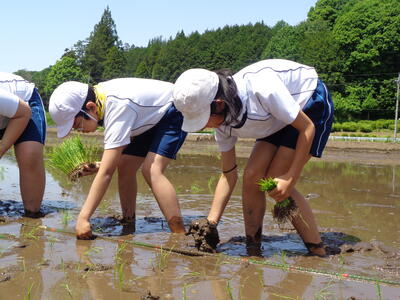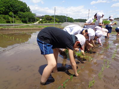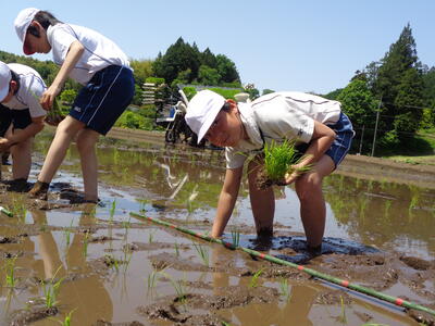 さて、去る5月17日(金)5年生がアグリ体験で笹原田の川又さん宅にて田植えを実施しました。