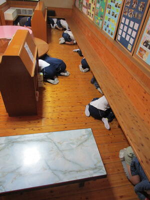 5月22日(水)本日、避難訓練をしました。竜巻を想定して、学校内の安全な場所にて「ダンゴムシ」の形で避難しました。(頭や首を守る姿勢が取れました。)