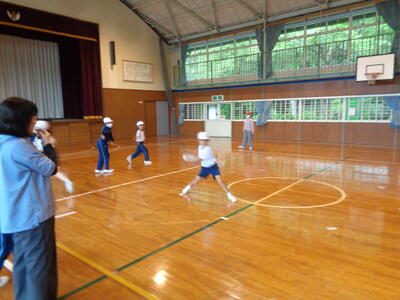 まずは体育館。4年生がリズムに合わせてジャンプ、ジャンプ!「たっのし~い。」準備運動はばっちり。