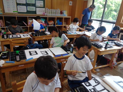 ↑5年生の学習の様子です。図形で模様づくりをしました。
