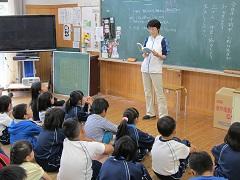 1年生は小松さんが「てがみをください」「ぴょんはかせのてんきそうだんじょ」「はやくねてよ」を、2年生は松尾さんが「ひゃっくん」「ともだちや」を、3年生は三武さんが「とらよりこわいほしがき」「うんちのちから」「なにをたべたかわかる?」を、4年生は樋口教諭が「裸の王様」を、5年生は皆川さんが「つりばしわたれ」「かっぱ」を、6年生は仲山さんが「オオカミから犬へ」「おじいちゃんのまち」を読んでくださいました。