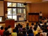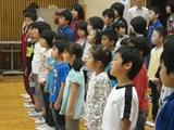 12日(水)の業間活動は、今年度、初めての音楽集会でした。今回は「校歌」と「さんぽ」の全校合唱でした。子どもたちは校歌が大好きです。大きな明るい声がふれあい広場に響き渡っていました。この日は、学校評議員会議があり、学校評議員さんに参観していただきました。