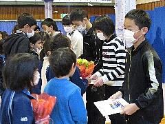 在校生代表の言葉を5年生の阿部いずみさんが心をこめて述べました。その後、在校生から6年生に、様々な思いを書いた寄せ書きときれいな花を手渡しました。