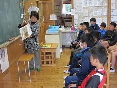 1年生は小松さんが「てがみをください」「ぴょんはかせのてんきそうだんじょ」「はやくねてよ」を、2年生は松尾さんが「ひゃっくん」「ともだちや」を、3年生は三武さんが「とらよりこわいほしがき」「うんちのちから」「なにをたべたかわかる?」を、4年生は樋口教諭が「裸の王様」を、5年生は皆川さんが「つりばしわたれ」「かっぱ」を、6年生は仲山さんが「オオカミから犬へ」「おじいちゃんのまち」を読んでくださいました。