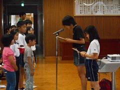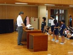 今回は、バレーボール部、町陸上記録会の入賞者、よい歯の作品コンクール入賞者、必読図書読破賞の児童に賞状や、缶バッチなどを手渡しました。