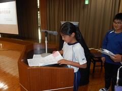 校長の話の後、体育主任の鯉沼教諭と運動委員の児童で、楽しく安全なプールの授業にするための約束や心構えの説明がありました。最後に児童代表で、平野悠太さんが意見を発表しました。晴れの日が待ち遠しいプール開きとなりました。