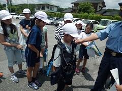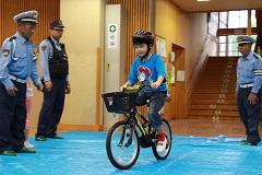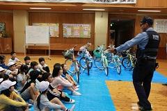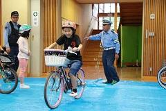 あいにくの雨で、校庭で実施することができず、ふれ合い広場で行いました。子どもたちの指導に、続谷駐在所の栁 和宏さん、交通指導員の大滝 挌さん、大塚 功さんが来てくださいました。子どもたちは、ハンドル、ペダルなどの自転車のパーツの名前や、乗り出す前に前後や後ろを確認すること、自転車は左を走ることなどがわかりました。また、命に直結する乗り物であることも理解できました。