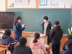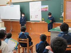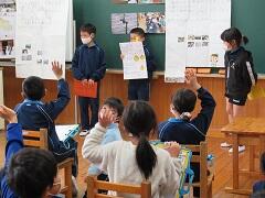 3月9日(火)、3年生が総合的な時間の学習で1年間学んできた「市貝町の自慢」のまとめの発表を2年生を招待して行いました。グループに別れてまとめた「梨づくり」、「杉山岩戸太々神楽」、「芝ざくら公園」、「入野家住宅」について、発表の途中にクイズを入れたりしながら、2年生にわかりやすく発表しました。3年生は上手に発表することができ、2年生は目をキラキラさせながら聞いていました。今後も、4年生が3年生を招待して福祉について発表する予定です。このような活動も本校のよさの1つだと思いますので、今後も数多く取り入れいきたいと思います。