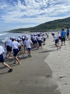 昨日の砂浜活動の様子、作品は、市貝小のホームページを見てください。(赤羽小のホームページにも、写真が掲載されていますので、ご参考にして下さい。)砂浜で作った作品は、テーマがカメ、船、富士山、、など、グループで相談して作りました。他校の5年生とシャッフルした班で作成しました。