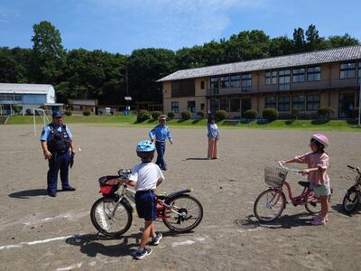 続谷駐在所の藤田さんと交通指導員の大塚さんに丁寧な御指導をいただきながら、真剣に練習に取り組みました。