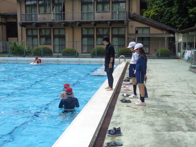 (安全確認のため、どの学級も教員は2人体制でプールの水の中と上で事故のないように小貝っ子の様子を確認して活動しています。)