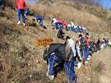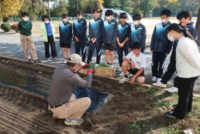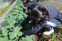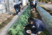 ブロッコリーに追肥をしました。小林用務員さん監修のもと追肥のやり方を教わっています。