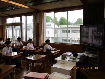 学級委員、受賞者は視聴覚室に集まって校長先生より賞状が授与され、他の生徒は各教室で視聴しました。