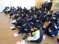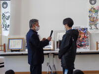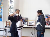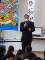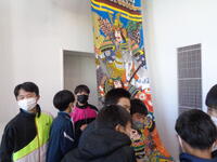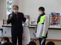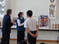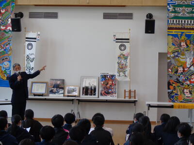 大畑先生には武者絵の実物を擁していただき、武者絵の歴史、制作の仕方について中学生にわかりやすく教えてくださいました。武者絵がなぜ!時は元禄時代市貝町にできたのかを知ることになりました。