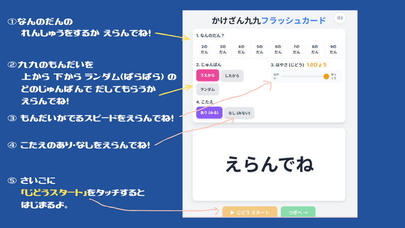 九九フラッシュカードのコーナーを新設しました 投稿日時 : 03/09 サイト管理者 川上小学校Webサイトに、九九フラッシュカードがプレイできるように、コーナーを新設しました。 ランダム、こたえなしで、全部クリアできるように練習しましょう。