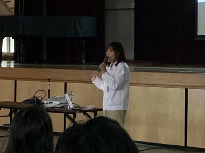 本日の総合の時間、1年生に向けて、代表生徒がマイ・チャレンジのまとめを発表しました。
