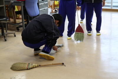 箒のはき方や目地に沿って雑巾がけすることなどを教えていただきました。