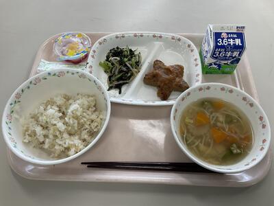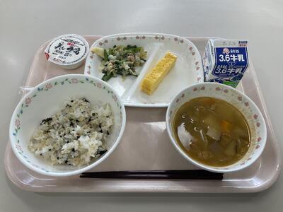 麦ごはん ふりかけ 牛乳 あじの南蛮漬け 海藻サラダ ビルマ汁