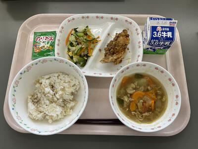 ごはん 牛乳 鶏のから揚げ香味ソース 磯辺あえ 豚汁 フルーツ杏仁風プリン