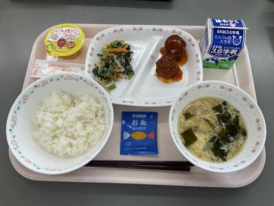 ごはん ふりかけ 牛乳 肉だんご ツナサラダ かきたま汁 2色ゼリー