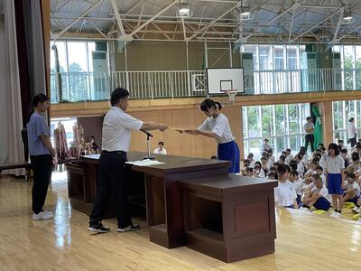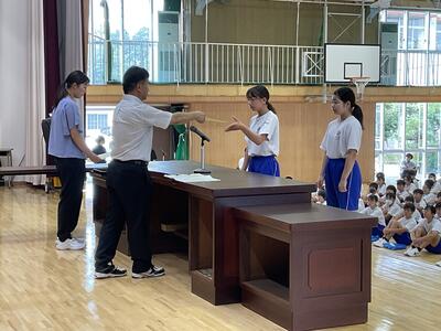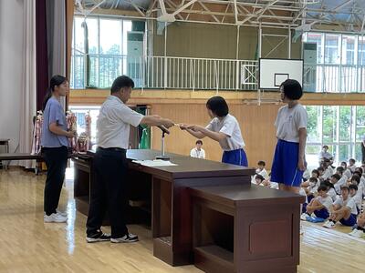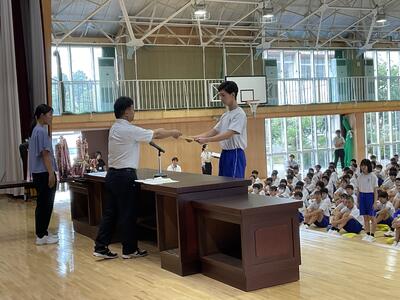 校長式辞では、時間を大切にしいろいろな体験にチャレンジすること、「早寝早起き朝ごはん」の生活リズムを整えることによって、有意義な夏休みにしてほしいというお話がありました。
