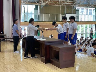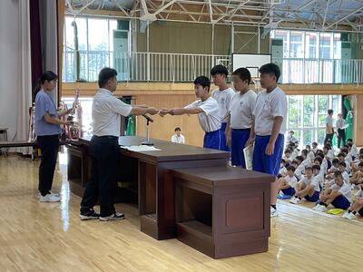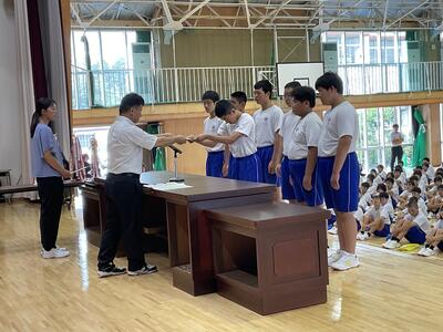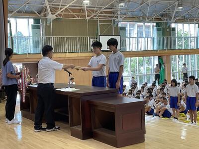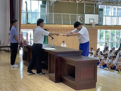 今日の朝会では地区総体各種大会の表彰が行われました。