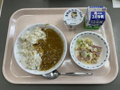 夏野菜のカレー(麦ごはん) 牛乳 花野菜とパスタのサラダ 県産ヨーグルト
