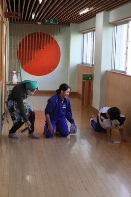 先生もいっしょに雑巾がけです。