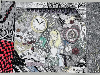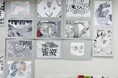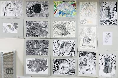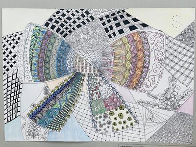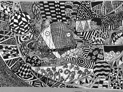 アート部5月の課題として、ゼンタングル作品を制作しました。ゼンタングルとは、シンプルな線や模様を繰り返し描くことで、瞑想状態やリラックス効果を体験できるアートです。部員たちは、集中してたくさんの線を描き、緻密な作品を完成させました。