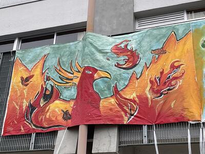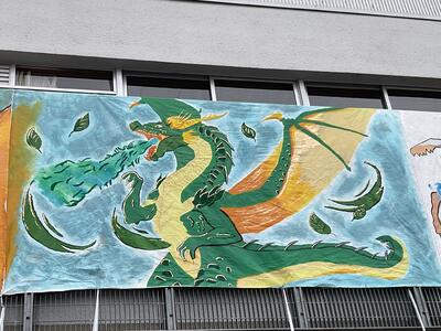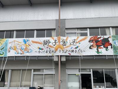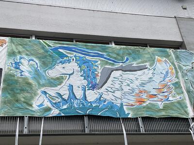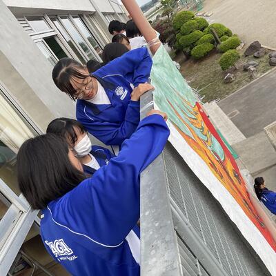 体育祭で無事、横断幕をお披露目することができました!前日と当日の朝に、アート部員で協力して設置しました。長期間に渡る制作でしたが、先輩と後輩の仲が深まる機会となり、部員たちは完成した作品を見て、達成感を感じているようでした。