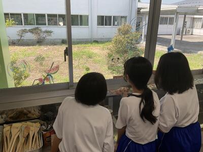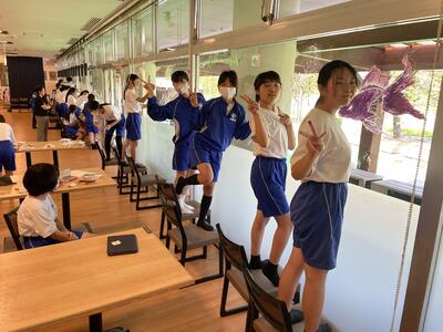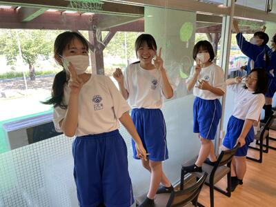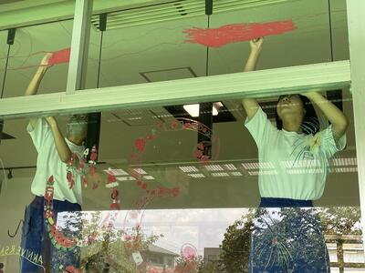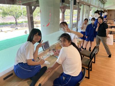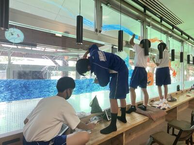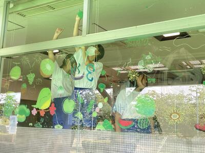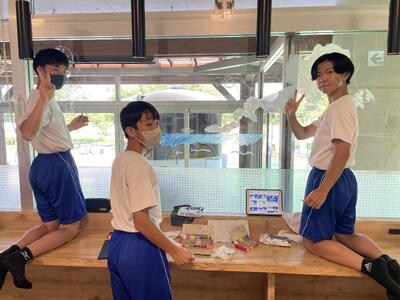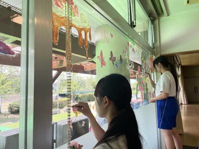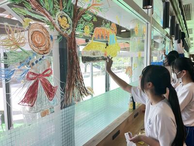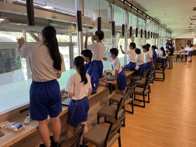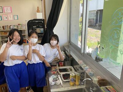 夏休み中の部活動がスタートしました!本日の部活動では、明日の校外活動(ロマンの湯、ウィンドウアート)に向けて、美術室の窓ガラスを使って練習しています。