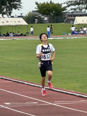 途中まで、ずっと先頭を維持していました。グループの2位でゴールしました。4分45秒のタイムでゴールしました。全体でも2位でしたので、県大会出場です。おめでとうございます。