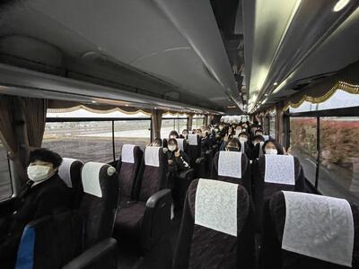吹奏楽部が出発前の音出し練習をしています。特に3年生の吹奏楽部員は合唱部を兼部している生徒も多いため先に出発しており、2年生が声をかけ合いながら最後の練習をしています。