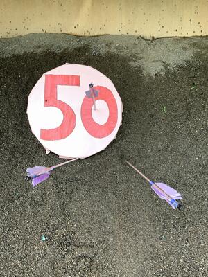 本日は3年生を送る会です。2年生が中心になって街の企画を行いました。いつもとは違って様々の点数の的があります。楽しいゲーム形式によるチーム戦です。