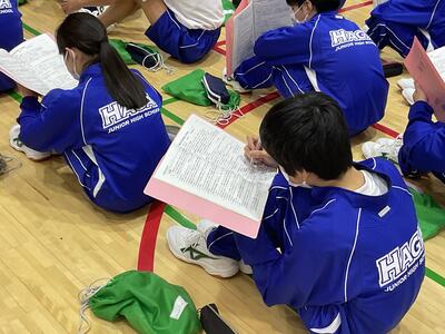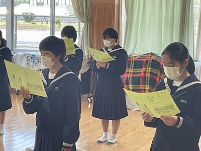 2組は音楽の授業でした。校歌を練習していました。友人と確かめながら歌っていました。