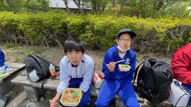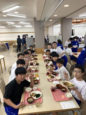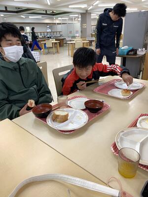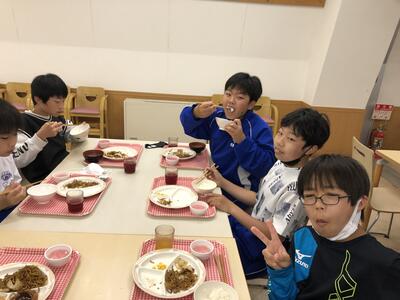 夕食を食べています。スタンツの練習がハードだったのか、食べる勢いがあります。
