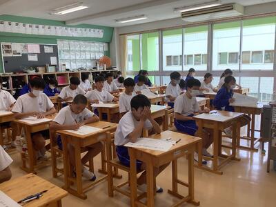 本日準備登校として、実力テストが実施されています。眠い目をこすりながら一生懸命問題を解こうとしている姿が見られます。明日から学校生活が始まります。まだまだ暑い日が続きそうですので、しっかり食べてしっかり寝て、体調管理をしていきましょう。