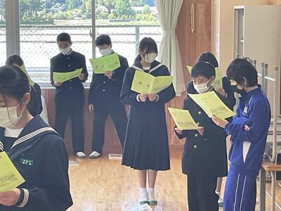2組は音楽の授業でした。校歌を練習していました。友人と確かめながら歌っていました。
