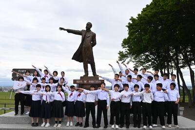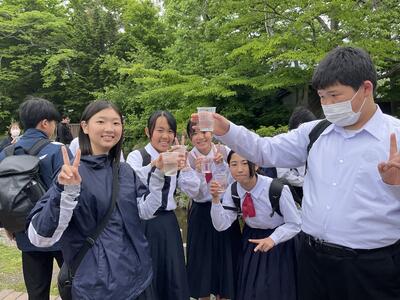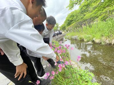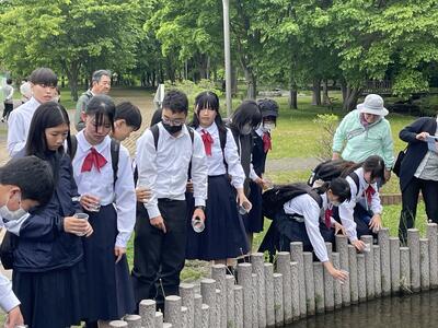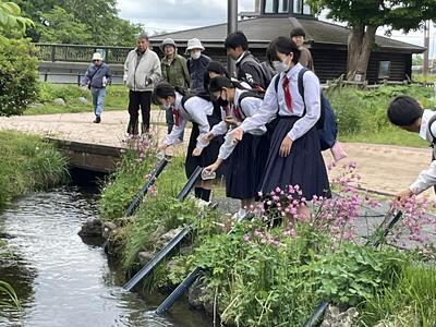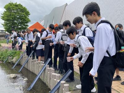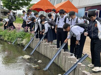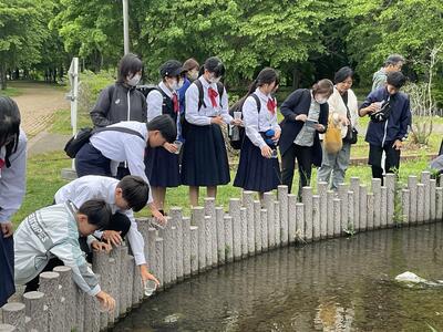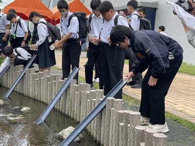 芳賀中の2年生が放した鮭が大人になって千歳川に戻ってくることを願って、放流しました。