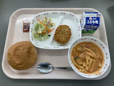 コロッケバーガー 牛乳 コールスロー マカロニのトマトクリーム煮