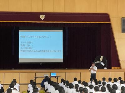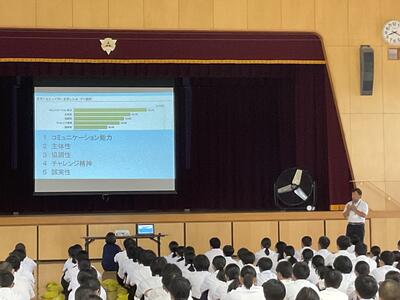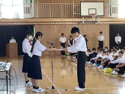 生徒の皆が募集したものの中から選ばれたスローガンが発表され、スローガンを考えた生徒の表彰が行われました。