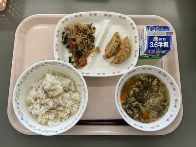 麦ごはん 牛乳 ギョーザの甘酢かけ チャプチェ もずくのスープ