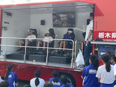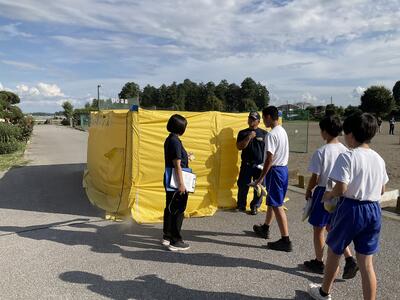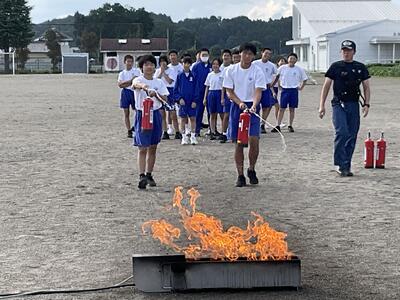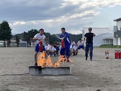 強い地震が起こった後、校内で火災が発生したという設定のもとでの避難訓練が行われました。校庭への避難後、火事や地震の体験学習を行いました。