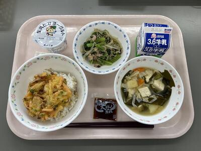 かき揚げ丼(麦ごはん) 牛乳 ツナあえ ゆばのみそ汁 県産ヨーグルト