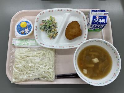けんちんうどん 牛乳 焼き栗コロッケ ほうれん草サラダ 十五夜デザート