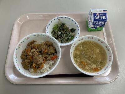 麦ごはん ふりかけ 牛乳 酢豚 中華くらげあえ 豆腐と卵のスープ