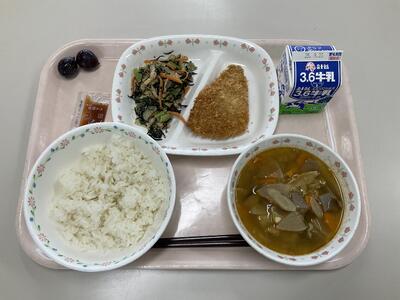 ごはん 牛乳 黄鯛フライ ひじきのごまあえ ピリ辛みそ汁 ぶどう