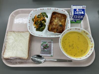食パン ジャム 牛乳 なすとトマトのミートグラタン こんにゃくと海藻のサラダ パンプキンポタージュ