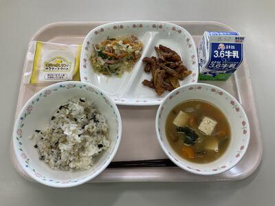 わかめごはん 牛乳 豚肉とごぼうのカリン揚げ 春雨サラダ なめこ汁 レモンタルト