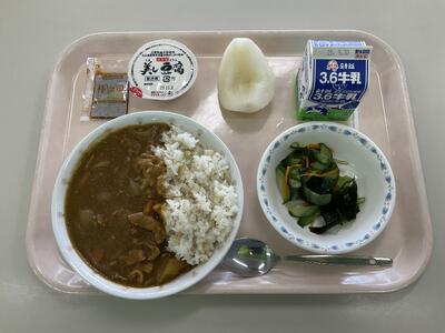 チキンカレー(麦ごはん) 牛乳 豆腐サラダ 梨